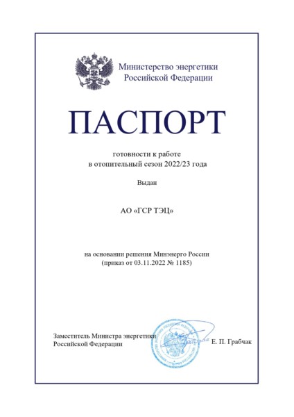 Министерством энергетики РФ выдан паспорт готовности к работе в отопительный сезон 2022/23 года